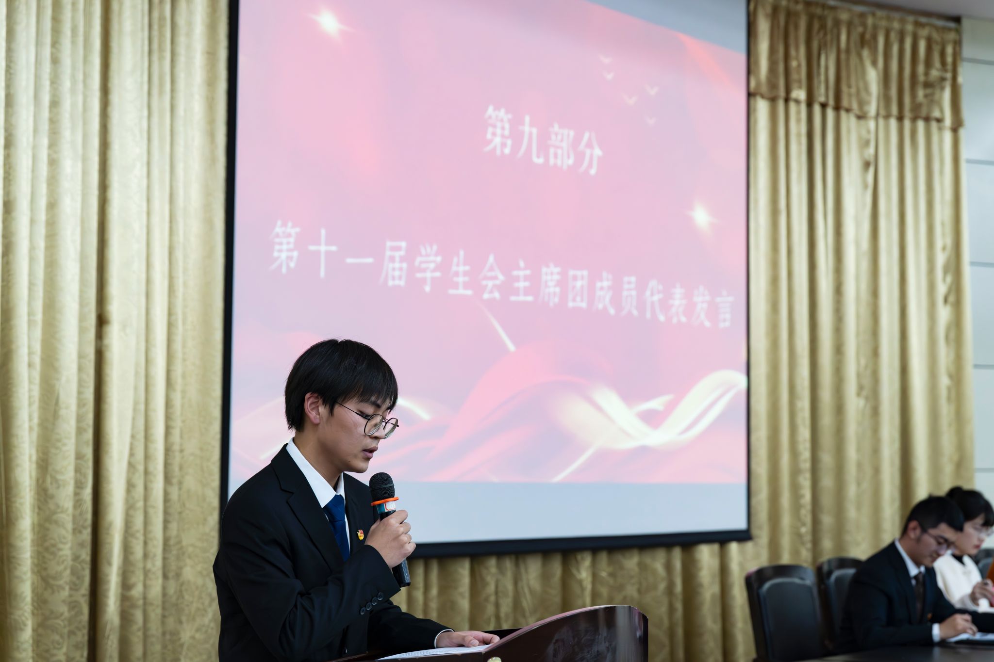 会议伊始,全体与会人员起立奏唱《中华人民共和国国歌》。随后,会议以无记名投票和差额选举的方式,民主选举产生了新一届学生会委员会委员6名、学生会主席团成员3名。第十届学生会执行主席冯隆宇上台做总结报告,新任执行主席苏轩代表主席团作表态发言。