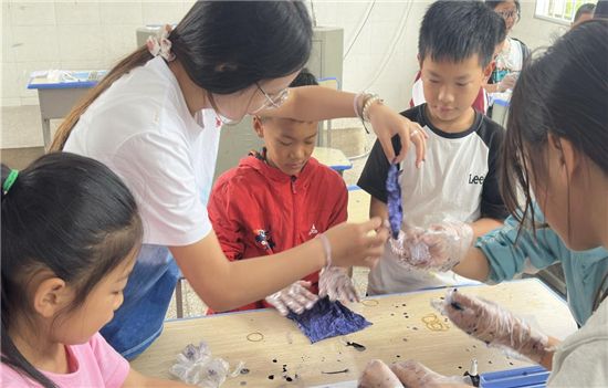 染香院里,李娇雪老师握白族阿妈的手,教孩子将棉布折成莲花状扎紧。“白族扎染的一针一线,是和自然的对话。”课堂上,寸熠榕屏息捆布角,靛蓝液体漫过布料时,她惊呼:“我的布上长出了苍山云海!”蓝白纹路如水墨舒展,尽显非遗灵动。