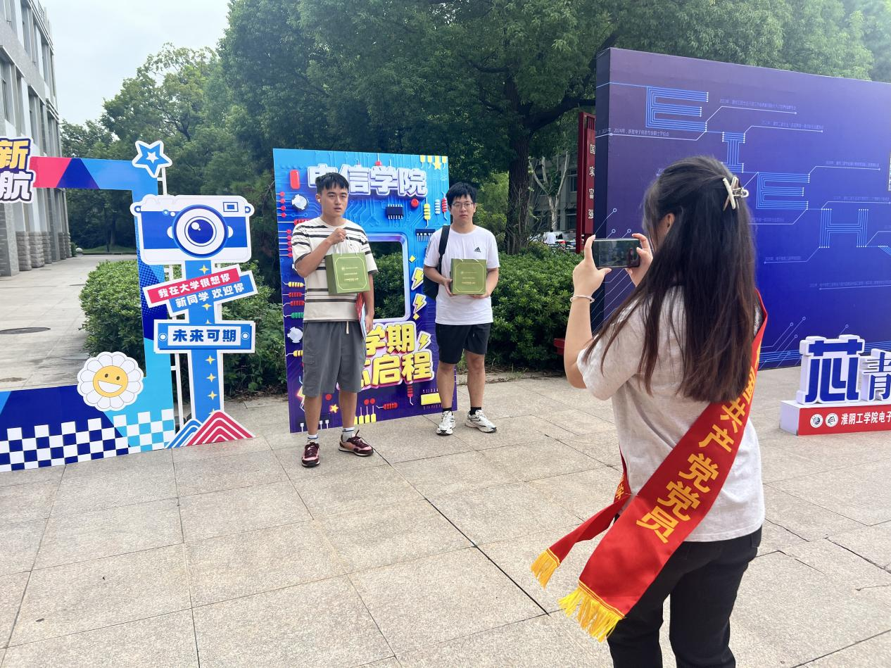 与科技感十足的展示相呼应的是电信学院无微不至的人文关怀。学院特别设置了“青春开学季,你好新同学”主题拍照打卡点,精心设计的背景板和趣味相框吸引了众多新生及家长驻足留念,记录下大学第一天的珍贵瞬间。