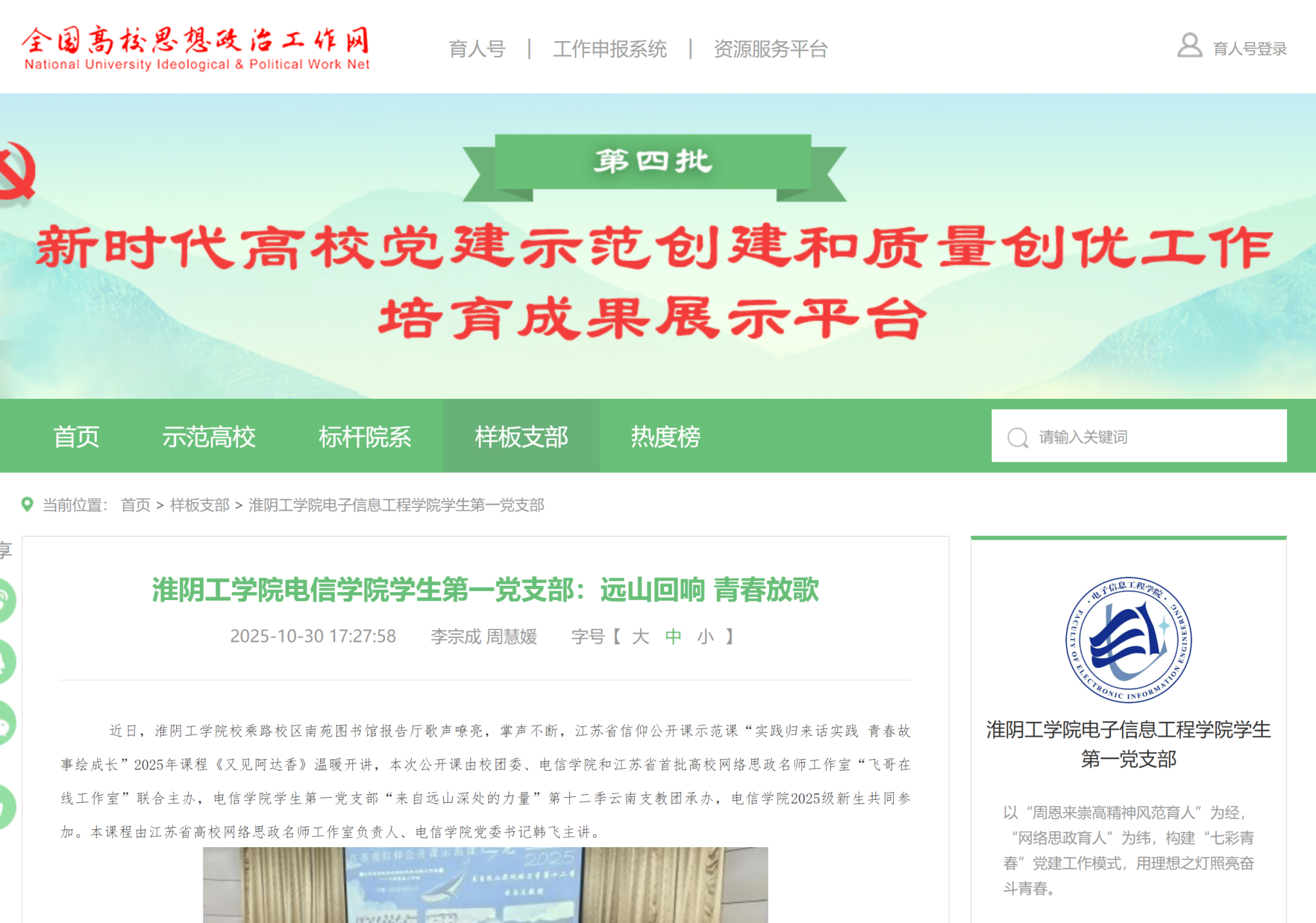 近日,淮阴工学院校乘路校区南苑图书馆报告厅歌声嘹亮,掌声不断,江苏省信仰公开课示范课“实践归来话实践 青春故事绘成长”2025年课程《又见阿达香》温暖开讲,本次公开课由校团委、电信学院和江苏省首批高校网络思政名师工作室“飞哥在线工作室”联合主办,电信学院学生第一党支部“来自远山深处的力量”第十二季云南支教团承办,电信学院2025级新生共同参加。本课程由江苏省高校网络思政名师工作室负责人、电信学院党委书记韩飞主讲。